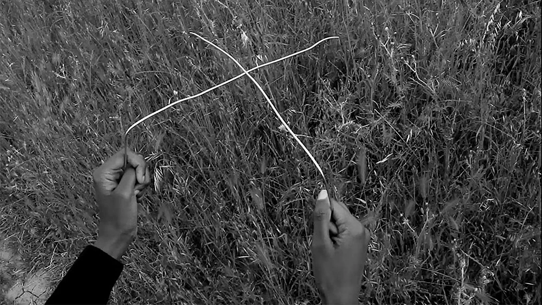 In Challenger Deep, the camera adopts the perspective of being close to the ground, concentrating on the artist’s hands as she moves through an empty landscape. Dionne Lee searches the site with dowsing rods, ancient tools for finding water, understood to move in response to unseen forces in the environment. Her act suggests that with groundwater diminishing across the globe—just one of many environmental crises challenging human survival—creative or even magical solutions become increasingly necessary. She has explained, “in the end survival seems to come from a marriage of practical knowledge and faith in something unknowable.” In Challenger Deep, the unseen and the unknowable seem to be where we might find the true or the real.